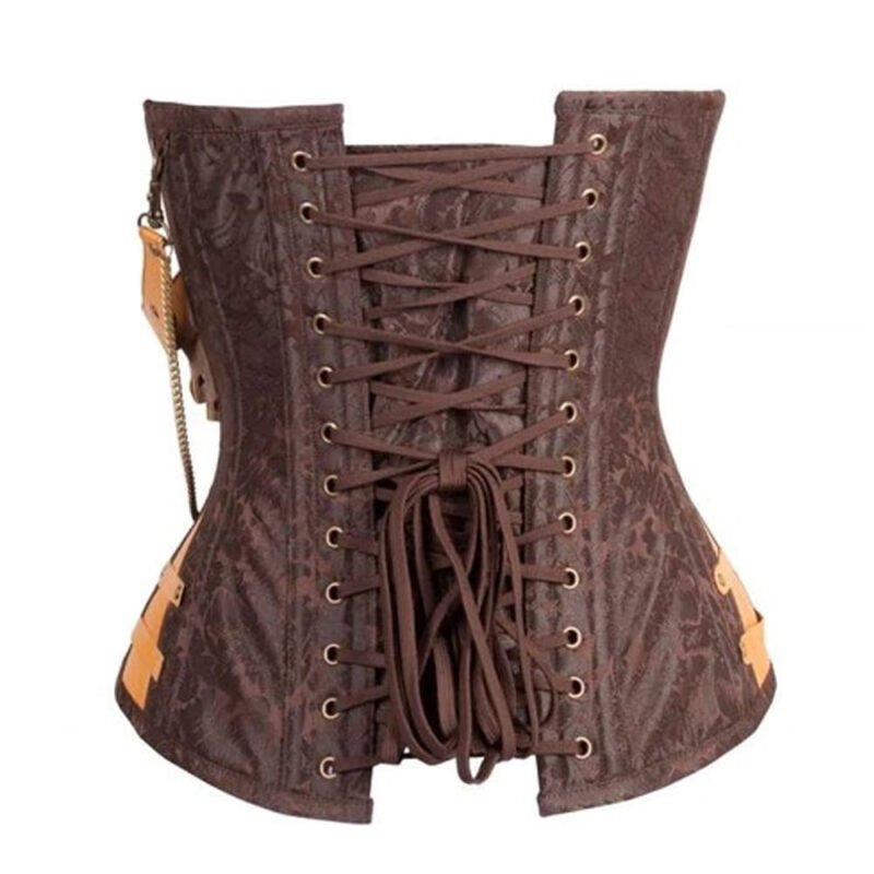 Alchimista — Women’s Dark Chocolate Brown Jacquard Brocade & Tan Camel Genuine Leather Trim Sweetheart Halter Neck Overbust Corset Bustier Top with Toggle Buckle Strap Chain Detail Boned Steampunk Victorian Gothic Vintage Costume Shapewear