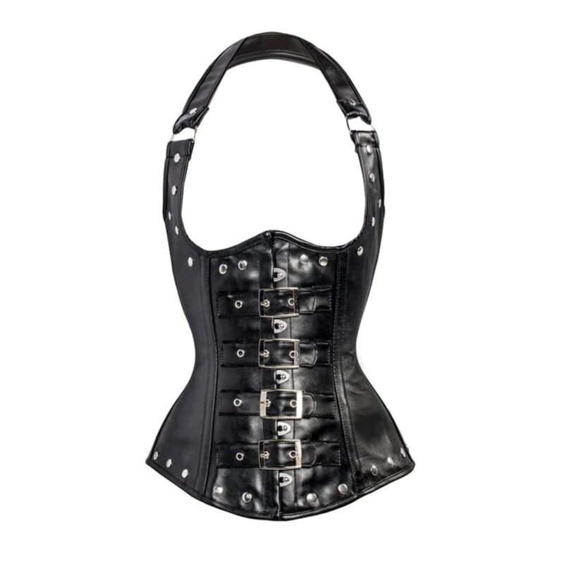 Acciaio Notte — Women’s Jet Black Faux Leather Halter Neck Underbust Waist Cincher Corset with Silver-Tone Double Row Eyelet Grommet Buckle Stud Detail Boned Lace-Up Back Gothic Punk Rock Edgy Dark Fantasy Costume Shapewear