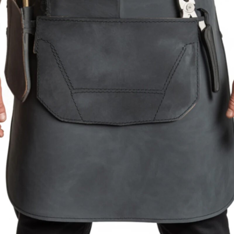 Acciaio Tattico — Men’s Gunmetal Steel Grey Genuine Waxed Full-Grain Cowhide Leather Heavy-Duty Adjustable Straight Cross-Back Strap Dark Gunmetal-Tone Buckle Large Chest Flap Pocket Zipper Side Pocket Dual Lower Tool Multi-Pocket Mechanic Chef Barber Blacksmith Carpenter Craftsman Tactical Heavy-Duty Workshop Utility Apron