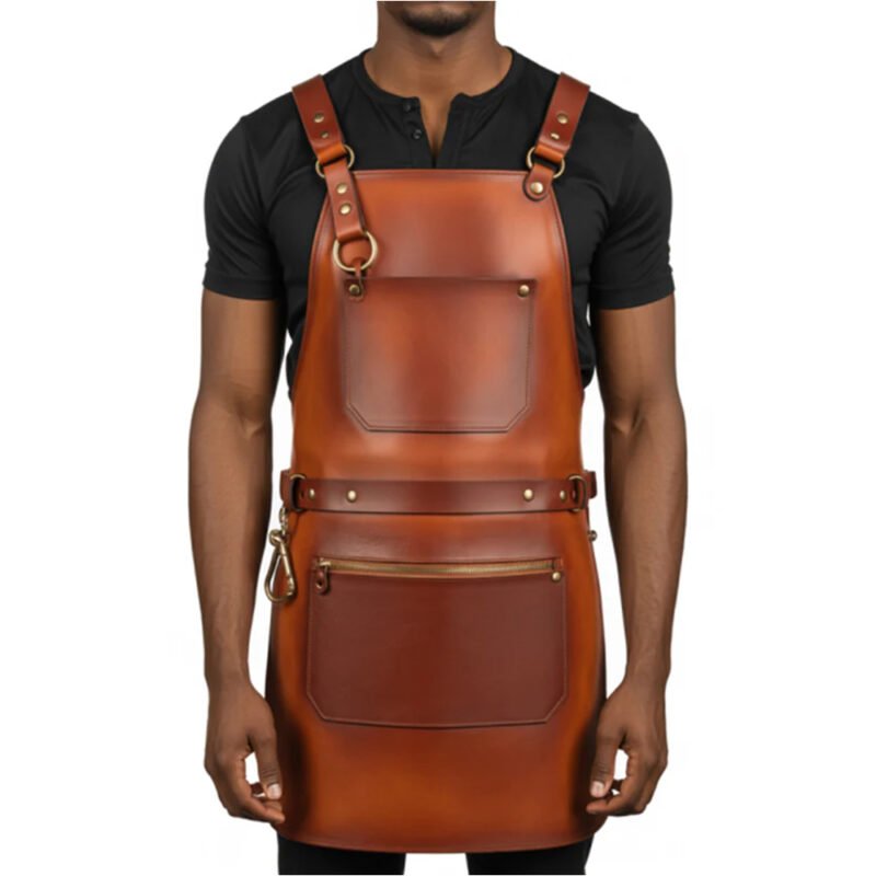 Ambra Lusso — Men’s Rich Amber Honey Cognac Tan Genuine Hand-Patina Burnished Full-Grain Cowhide Leather Heavy-Duty Adjustable Cross-Back Strap Gold O-Ring Hardware Large Upper Chest Pocket Dual Lower Zipper Pocket Gold Zipper Pull Contrast Edge Stitch Sleek Structured Design Chef Barber Sommelier Stylist Craftsman Refined Luxury Professional Salon Restaurant Workshop Utility Apron