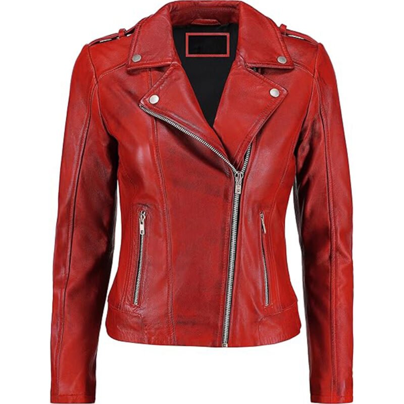 Scarletto — Women’s Fiery Crimson Red Genuine Leather Epaulette-Shoulder Asymmetric-Zip Slim-Cut Urban Rider Jacket