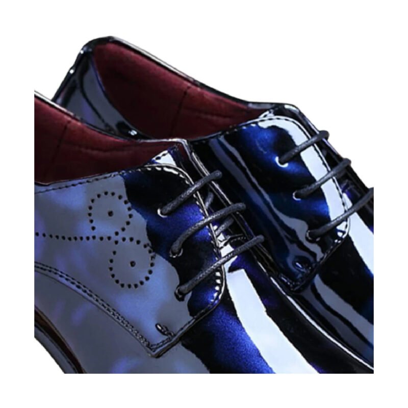 Adriano — Men’s Navy Blue Patent Leather Pointed-Toe Floral Brogue Lace-Up Oxford Party Dress Shoes with Burgundy Lining