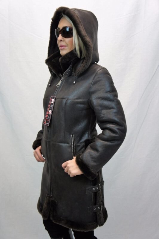 Abbraccio — Women’s Dark Mocha Brown Genuine Suede Leather Slim Fit Asymmetric Zip Moto Biker Jacket with Oversized Wrap Camel Tan Curly Shearling Fur Collar Cuffs Trim Lining Cozy Luxe Winter Chic Outerwear