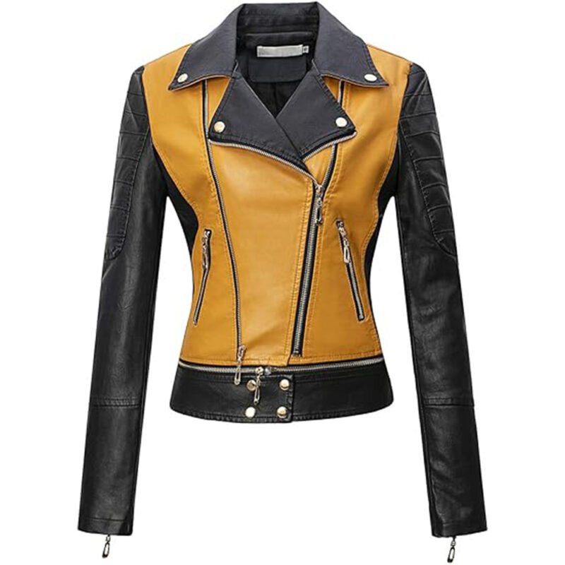 Bicolaro — Women’s Bold Amber & Onyx Black Genuine Leather Contrast-Panel Asymmetric-Zip Belted Fashion Biker Jacket