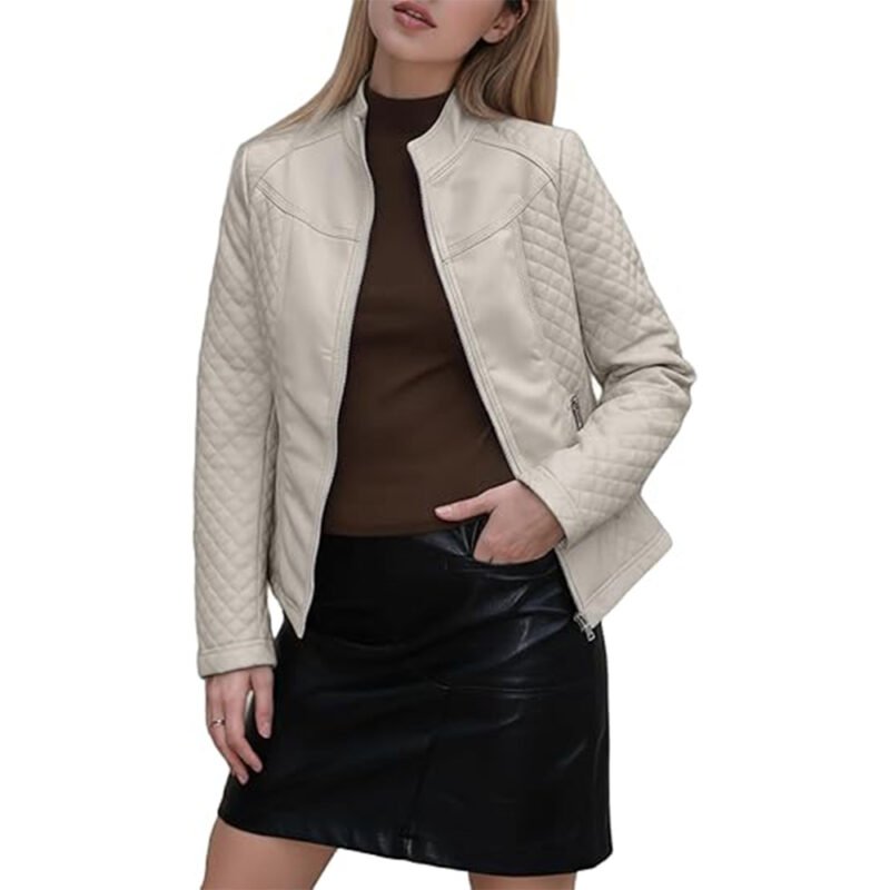 Blancorra — Women’s Pristine Ivory White Genuine Leather Mandarin-Collar Side-Zip Clean-Finish Everyday Casual Jacket