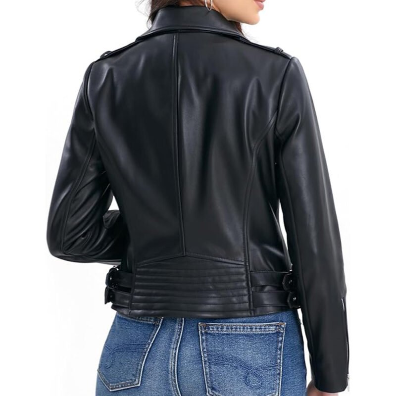 Dravenix — Women’s Jet Black Genuine Leather Notch-Lapel Epaulette Silver-Snap Asymmetric-Zip Street Moto Jacket