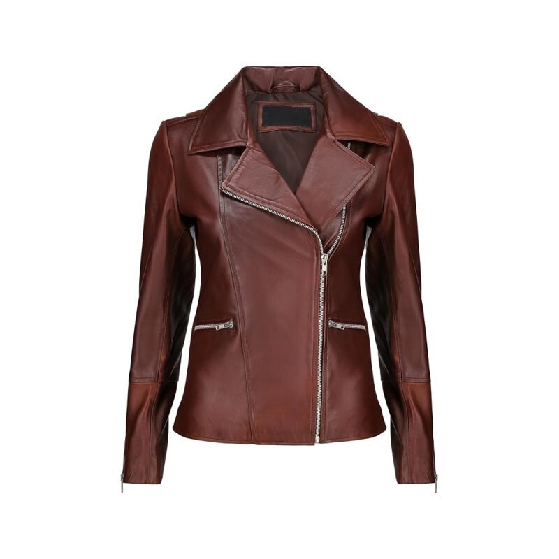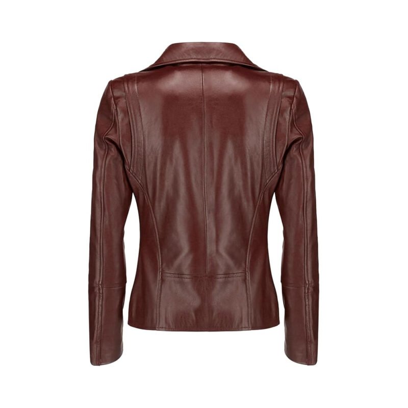 Brunello — Women’s Rich Oxblood Mahogany Genuine Leather Notch-Lapel Dual Silver-Zip Sculpted Slim Rider Jacket