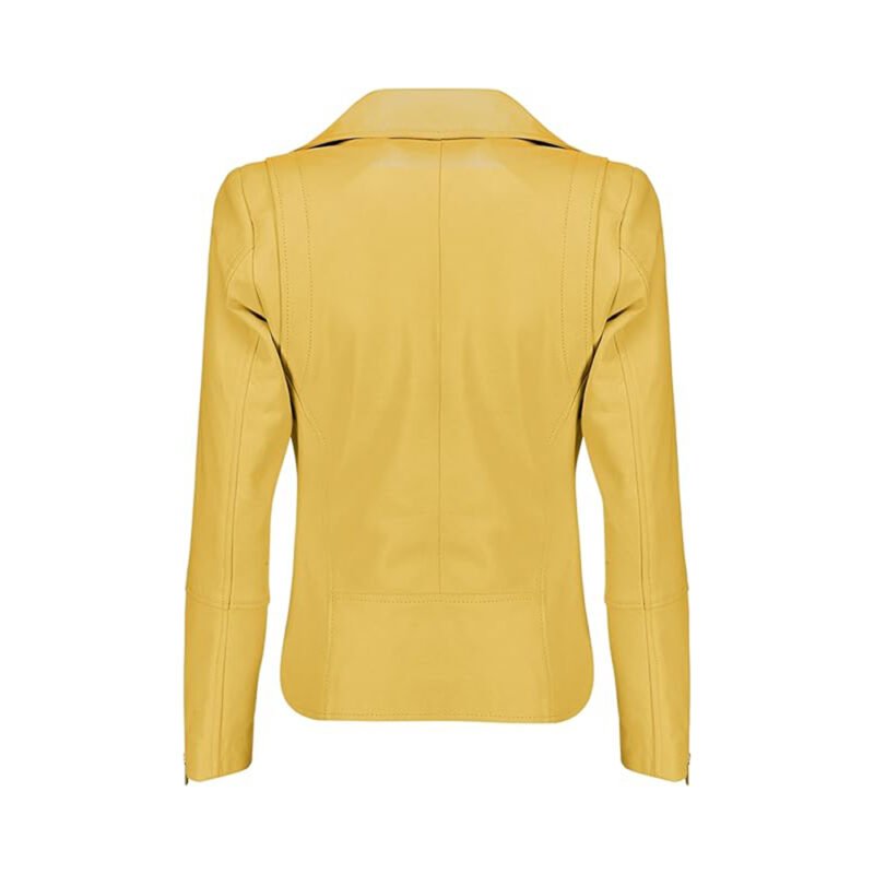 Solenzo — Women’s Vivid Canary Yellow Genuine Leather Wide-Lapel Multi-Zip Peplum-Cut Fashion Moto Jacket