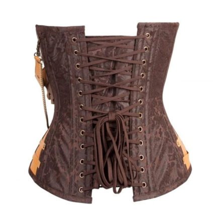 Artigiano Vapore — Women’s Honey Tan & Dark Brown Striped Faux Leather Two-Tone Underbust Waist Cincher Corset with Antique Brass-Tone Clasp Lock Stud Rivet Buckle Strap Detail Boned Lace-Up Back Steampunk Victorian Armor Costume Shapewear