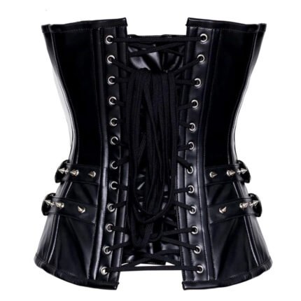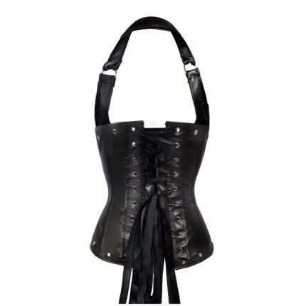 Acciaio Notte — Women’s Jet Black Faux Leather Halter Neck Underbust Waist Cincher Corset with Silver-Tone Double Row Eyelet Grommet Buckle Stud Detail Boned Lace-Up Back Gothic Punk Rock Edgy Dark Fantasy Costume Shapewear