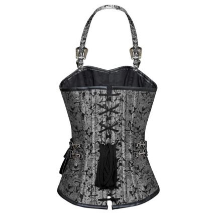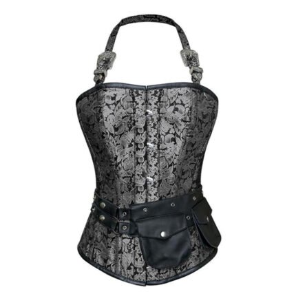 Argento Oscuro — Women’s Silver Grey Black Jacquard Brocade & Faux Leather Halter Neck Overbust Corset Bustier Top with Silver-Tone Skull Clasp Detachable Mini Pouch Pocket Buckle Strap Detail Boned Lace-Up Gothic Steampunk Victorian Dark Fantasy Costume Shapewear