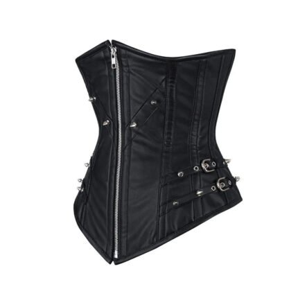Nero Ribelle — Women’s Jet Black Satin Faux Leather Underbust Waist Cincher Corset Front Diagonal Silver Zipper Closure Silver Stud Rivet Detail Side Double Silver Buckle Strap Hardware Asymmetric Curved Top Hem Vertical Boning Panel Seam Flared Hip Bottom Panel Structured Lace-Up Back Dark Gothic Punk Moto-Inspired Victorian Steampunk Armor Costume Shapewear