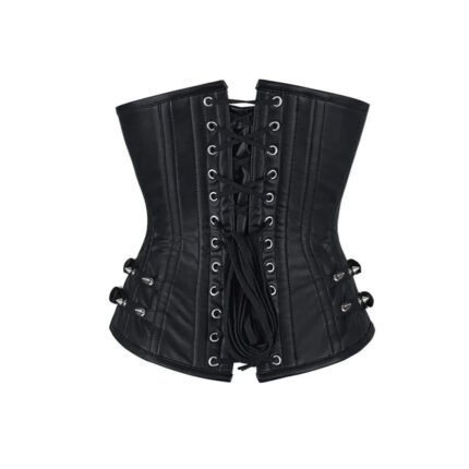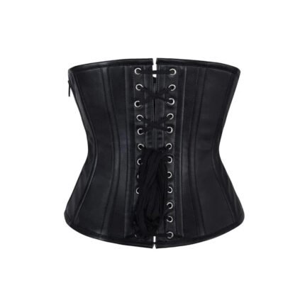 Nero Oscura — Women’s Pure Jet Black Smooth Faux Leather Underbust Waist Cincher Corset Silver Hook-and-Eye Front Busk Fastening Subtle Vertical Panel Seam Detail Curved Flared Hip Panel Heavily Boned Structured Lace-Up Back Waist Training Clean Minimal Gothic Victorian Steampunk Armor Costume Shapewear