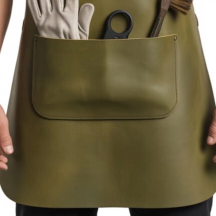 Oliva Militare — Men’s Army Olive Military Khaki Green Genuine Smooth Full-Grain Cowhide Leather Heavy-Duty Adjustable Straight Cross-Back Strap Clean Bib Front Large Lower Front Pocket Garden Glove Holder Scissor Slot Brush Loop Hand Tool Pocket Gardener Florist Horticulturist Craftsman Chef Barber Military-Inspired Structured Professional Outdoor Workshop Utility Apron