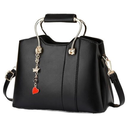Cuorezza — Women’s Jet Black Genuine Leather Gold-Tone Metal Handle Crown & Red Heart Charm Crossbody Shoulder Handbag