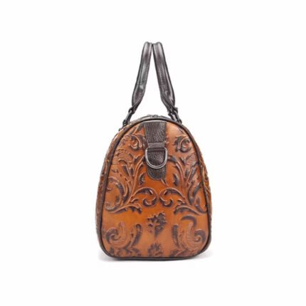 Barocchezza — Women’s Cognac Brown Genuine Hand-Tooled Baroque Floral Leather Barrel Boston Top Handle Crossbody Shoulder Handbag