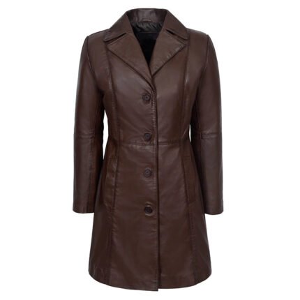 Principessa — Women’s Dark Chocolate Brown Genuine Soft Lambskin Leather Slim Fit Three-Quarter Length Trench Coat with Notch Lapel Collar Single-Breasted Button Front Classic Elegant Timeless Everyday Outerwear