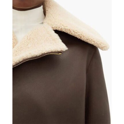 Oro Agnello — Women’s Dark Olive Khaki Brown Genuine Lambskin Leather Cropped Slim Fit Aviator Biker Jacket with Cream Ivory Thick Sherpa Shearling Fur Collar Lining Gold-Tone Zip-Up Luxe Minimalist Winter Chic Outerwear