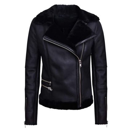 Notte Agnello — Women’s Jet Black Genuine Soft Lambskin Leather Slim Fit Asymmetric Diagonal Zip Moto Biker Jacket with Black Thick Sherpa Shearling Fur Lapel Collar Cuffs Lining Silver-Tone Multi-Zip All-Black Tonal Luxe Winter Outerwear