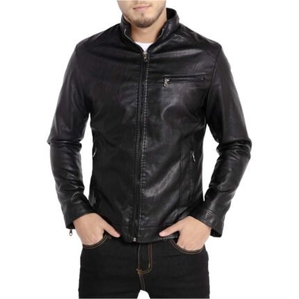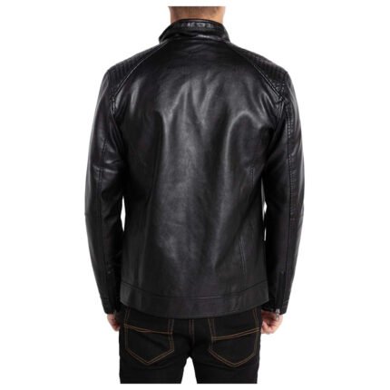 Noir Vantaggio — Men’s Classic Black Genuine Soft Lambskin Leather Slim Fit Stand Collar Moto Biker Jacket with Quilted Shoulder Panels, Chest Zip Pocket & Sleek Street Style Outerwear