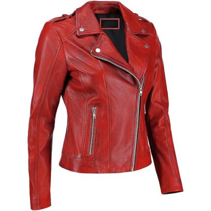 Scarletto — Women’s Fiery Crimson Red Genuine Leather Epaulette-Shoulder Asymmetric-Zip Slim-Cut Urban Rider Jacket