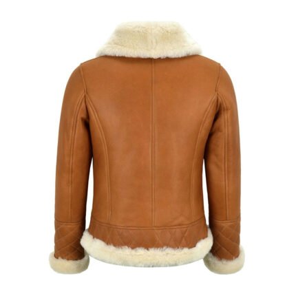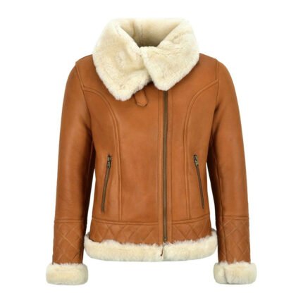 Sole Agnello — Women’s Honey Camel Tan Genuine Lambskin Leather Slim Fit B3 Aviator Flight Jacket with Cream Ivory Thick Sherpa Shearling Fur Collar Cuffs Hem Lining Diamond Quilt Detail Zip-Up Warm Luxe Winter Outerwear