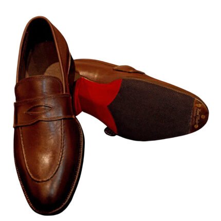 Pennino — Men’s Cognac Tan Genuine Leather Penny Loafer Slip-On Smart Casual Dress Shoes with Red Leather Lining and Leather Sole