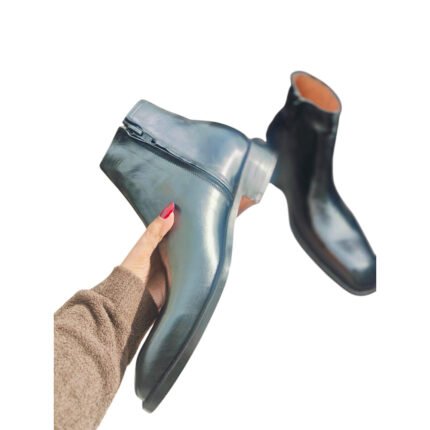 Nero Alto — Men’s Jet Black Genuine Leather Plain Toe Side Zip Ankle Boots with Leather Sole