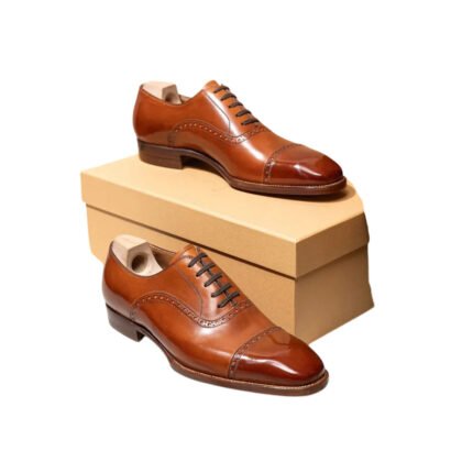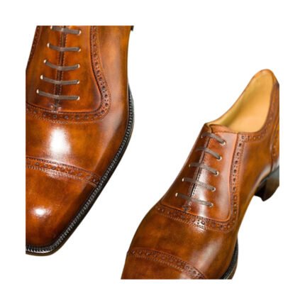 Clifton — Men’s Tan Brown Genuine Leather Cap-Toe Oxford Brogue Lace-Up Formal Dress Shoes with Leather Sole