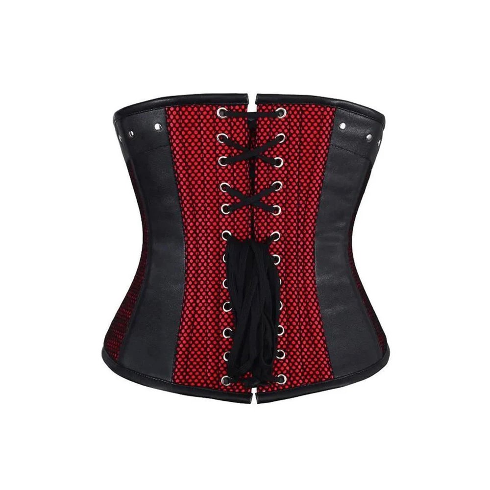 Rosso Guerriera — Women’s Jet Black Faux Leather Deep Red Mesh Net Two-Tone Underbust Waist Cincher Corset Wide Structured Collar Top Band Silver Stud Rivet Detail Front Center Black Panel Red Mesh Inset Panel Side Zipper Closure Heavily Boned Structured Lace-Up Back Dark Gothic Punk Victorian Armor Costume Shapewear