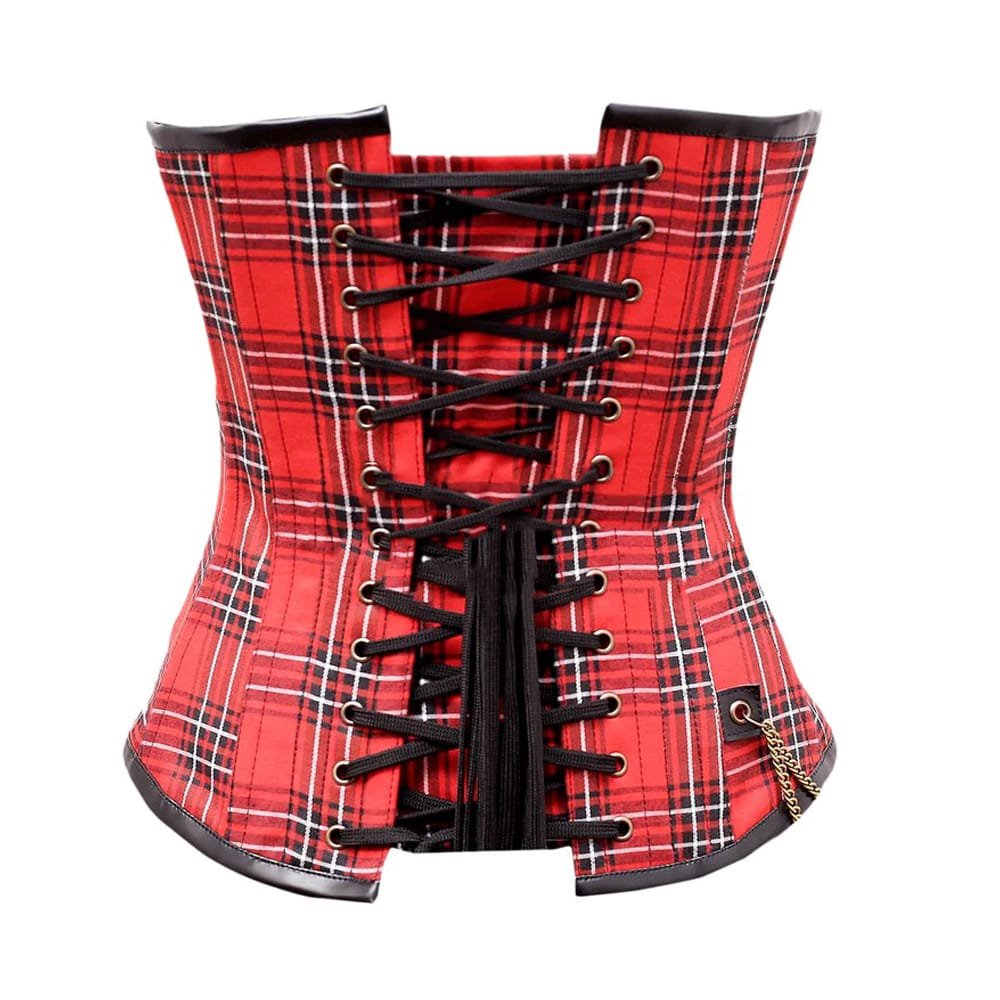 Ribelle Scozzese — Women’s Red Black Tartan Plaid & Faux Leather Two-Tone Sweetheart Overbust Corset Bustier Top with Antique Brass-Tone Buckle Strap Pocket Detail Side Zip-Up Boned Punk Rock Gothic Steampunk Costume Shapewear