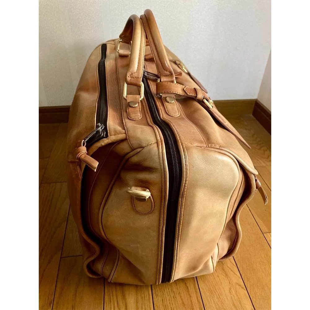 Lussogio — Men’s Vintage Tan Genuine Full-Grain Leather Large Duffle Holdall Weekend Travel Bag with Luggage Tag