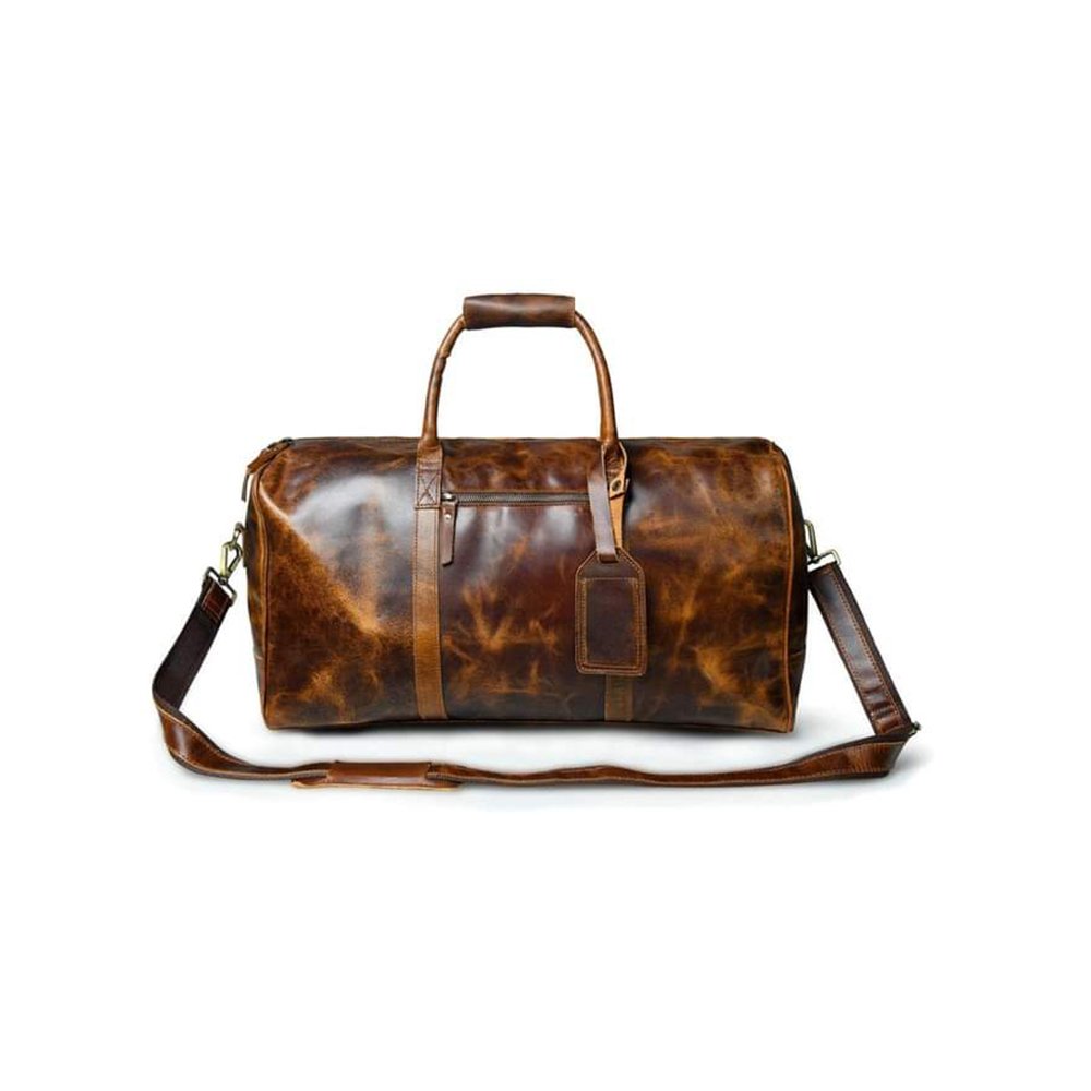 Rustaggio — Men’s Distressed Dark Tan Genuine Full-Grain Leather Large Round Duffle Holdall Weekend Travel Bag