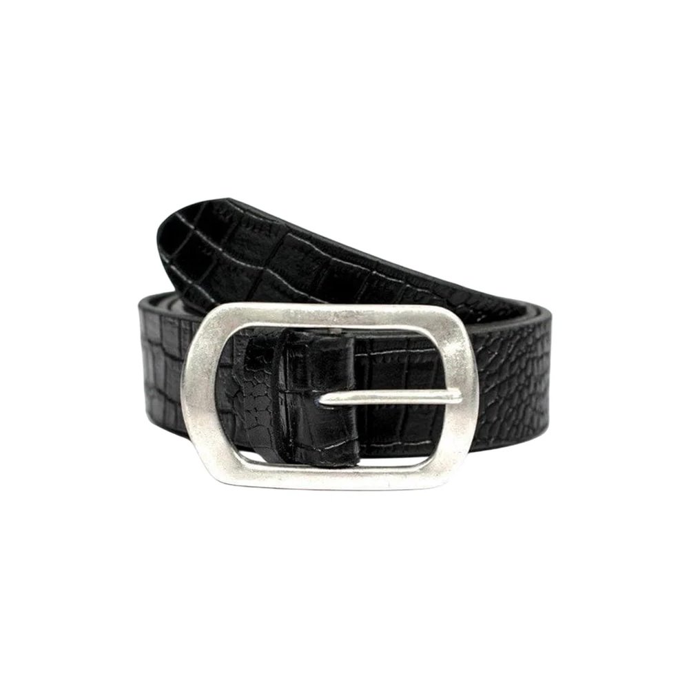Coccodrillo Nero — Women’s Jet Black Genuine Embossed Crocodile Texture Leather Wide Belt with Antique Silver-Tone Rectangular Buckle Bold Edgy Casual Everyday Chic Accessory