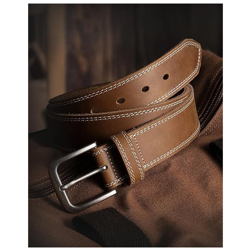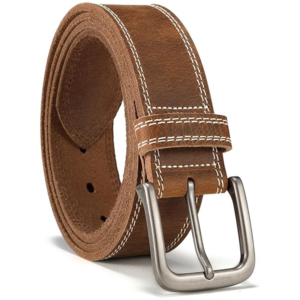 Brustavo — Men’s Rugged Saddle Tan Genuine Leather Distressed Double-Edge Stitch Matte Silver-Buckle Workwear Casual Belt