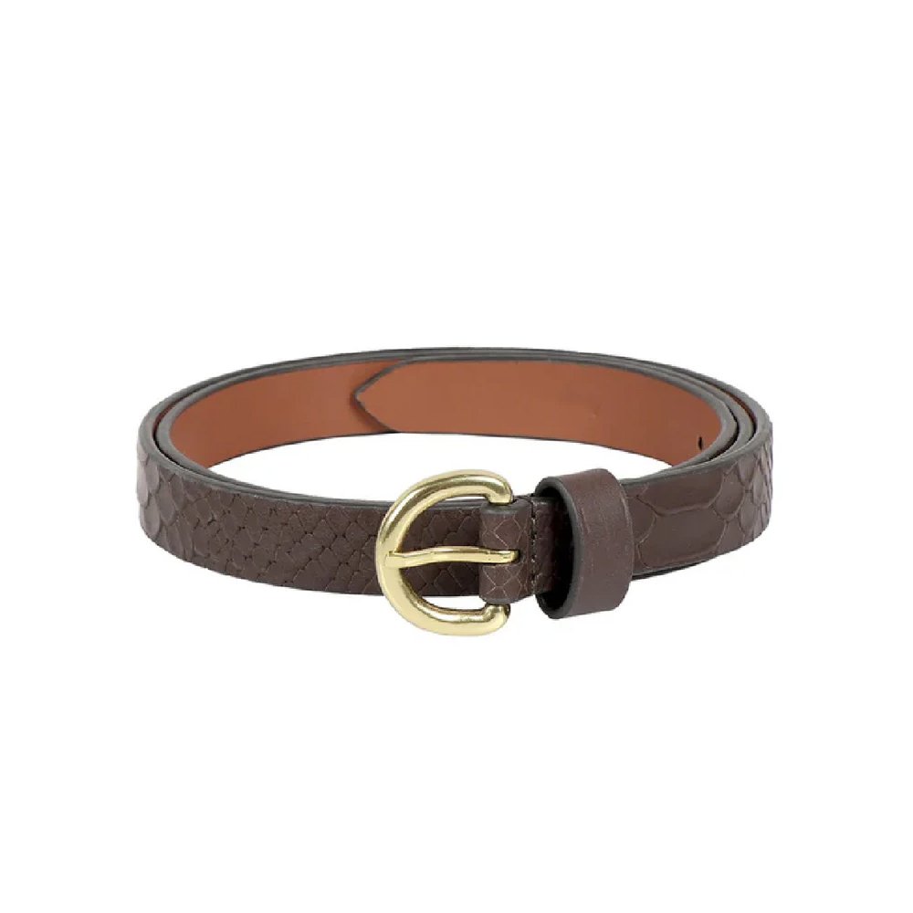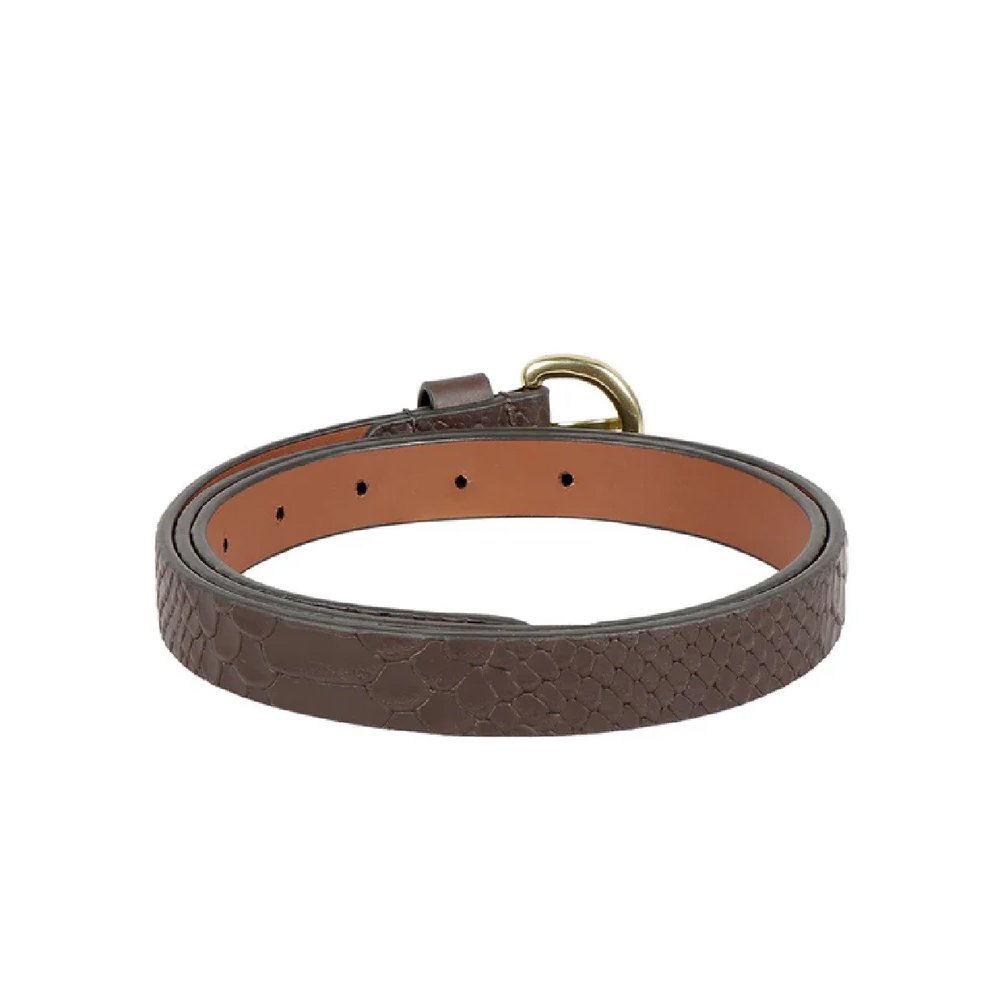 Serpente — Women’s Dark Chocolate Brown Genuine Embossed Snakeskin Texture Leather Skinny Belt with Gold-Tone Round Buckle Chic Everyday Waist Accessory
