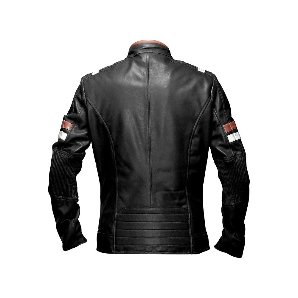 Striscia — Men’s Jet Black Genuine Soft Lambskin Leather Retro Cafe Racer Biker Jacket with Contrast White & Brown Stripe Detail Silver-Tone Multi-Zip Band Collar Vintage Street Style Outerwear