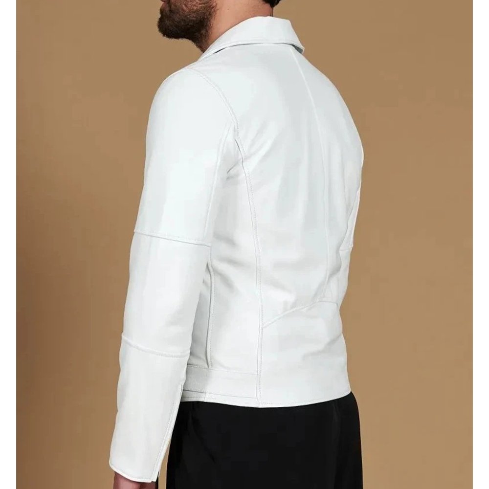 Zelvorne — Men’s Crisp White Genuine Soft Lambskin Leather Black-Contrast Zip Slim-Fit Band-Collar Dual Chest-Pocket Sleek Biker Jacket