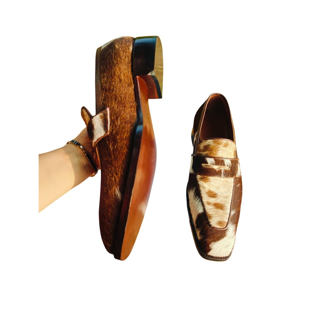Pampa — Men’s Brown & White Cowhide Hair-On Leather Penny Loafer Slip-On Smart Casual Dress Shoes with Leather Sole