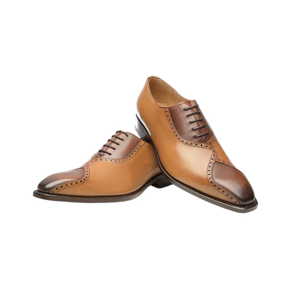 Rinaldo — Men’s Tan & Dark Brown Two-Tone Leather Cap-Toe Quarter Brogue Lace-Up Oxford Dress Shoes