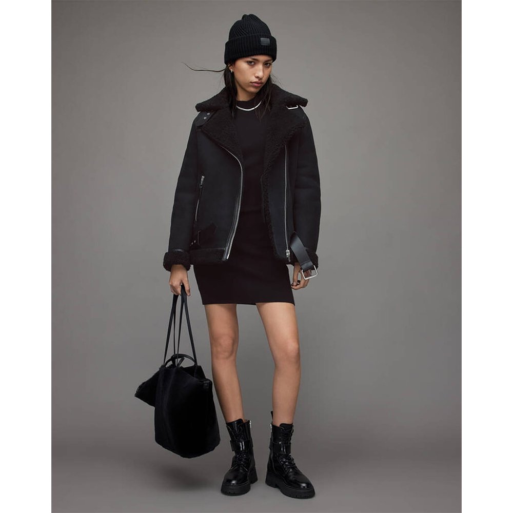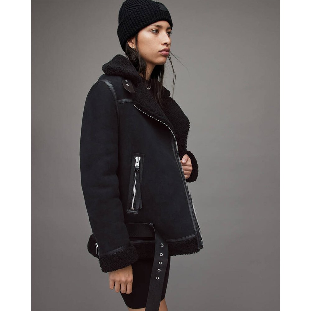 Oscura — Women’s Jet Black Genuine Suede Leather Oversized Asymmetric Zip Moto Biker Jacket with Black Sherpa Shearling Fur Collar Cuffs Lining All-Black Tonal Edgy Luxe Winter Street Style Outerwear