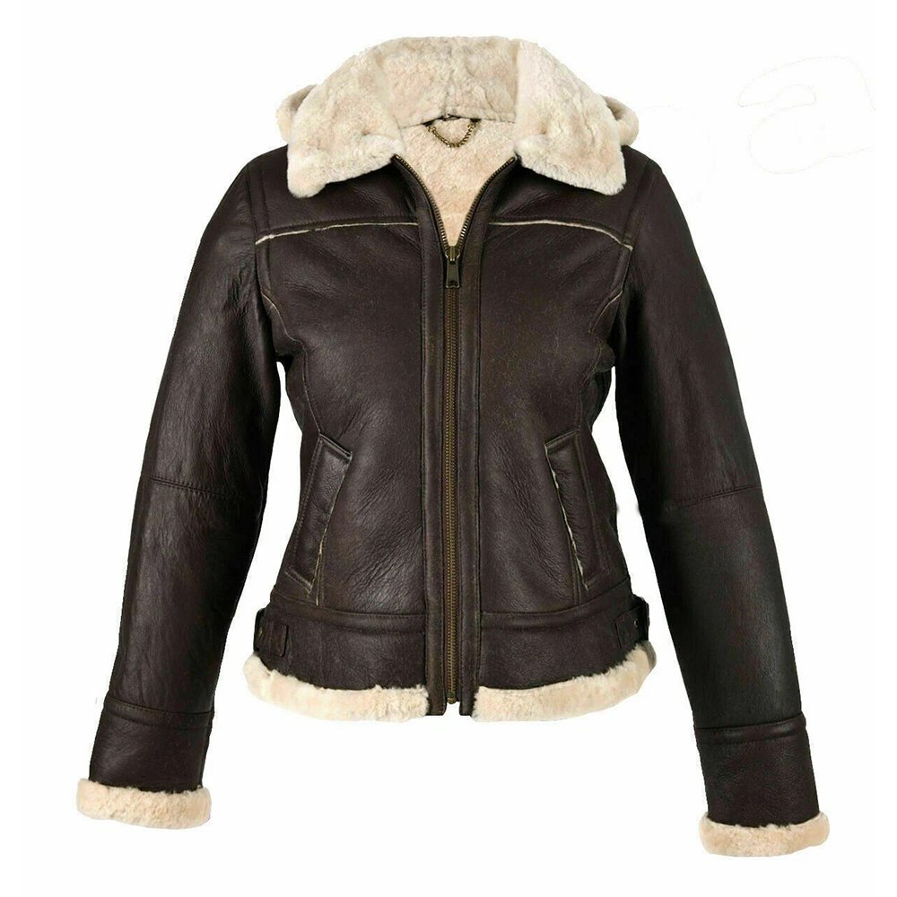 Calda Donna — Women’s Dark Espresso Brown Genuine Lambskin Leather Slim Fit B3 Bomber Aviator Flight Jacket with Cream Ivory Thick Sherpa Shearling Fur Collar Cuffs Hem Lining Zip-Up Warm Luxe Winter Outerwear