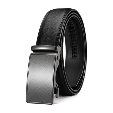 Veldcroft — Men’s Jet Black Genuine Leather Gunmetal Auto-Ratchet Plate-Buckle Smooth-Edge Sleek Executive Business Belt