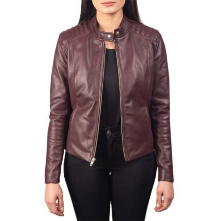 Viola Moto — Women’s Deep Plum Burgundy Genuine Soft Lambskin Leather Slim Fit Clean Minimalist Cafe Racer Biker Jacket with Silver-Tone Snap Button Band Collar Zip-Up Sleek Chic Everyday Street Style Outerwear