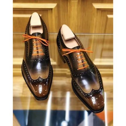 Bicolavio — Men’s Two-Tone Dark Brown & Tan Genuine Leather Full Brogue Wingtip Lace-Up Oxford Smart